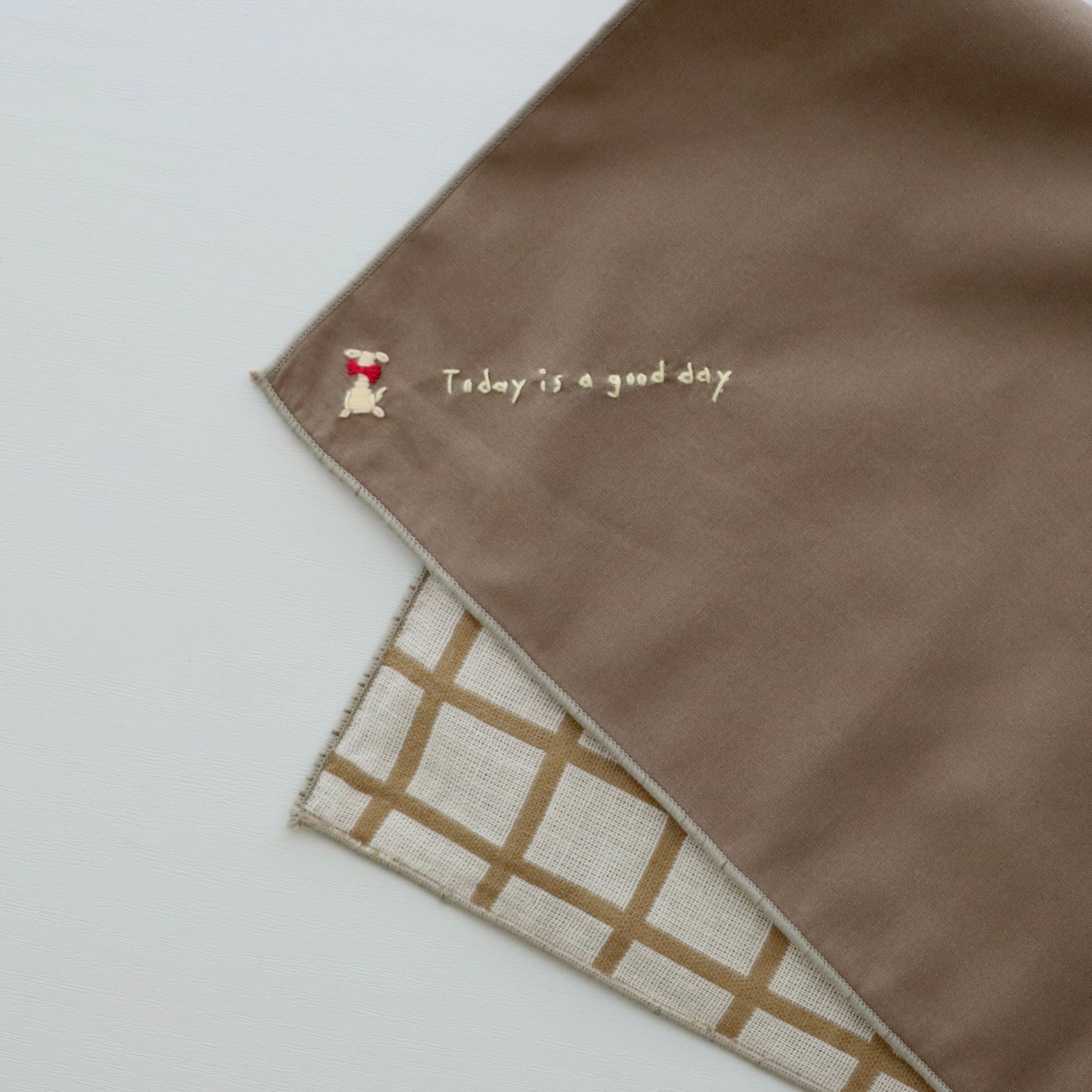 いぬと文字の手刺繍が入っています。